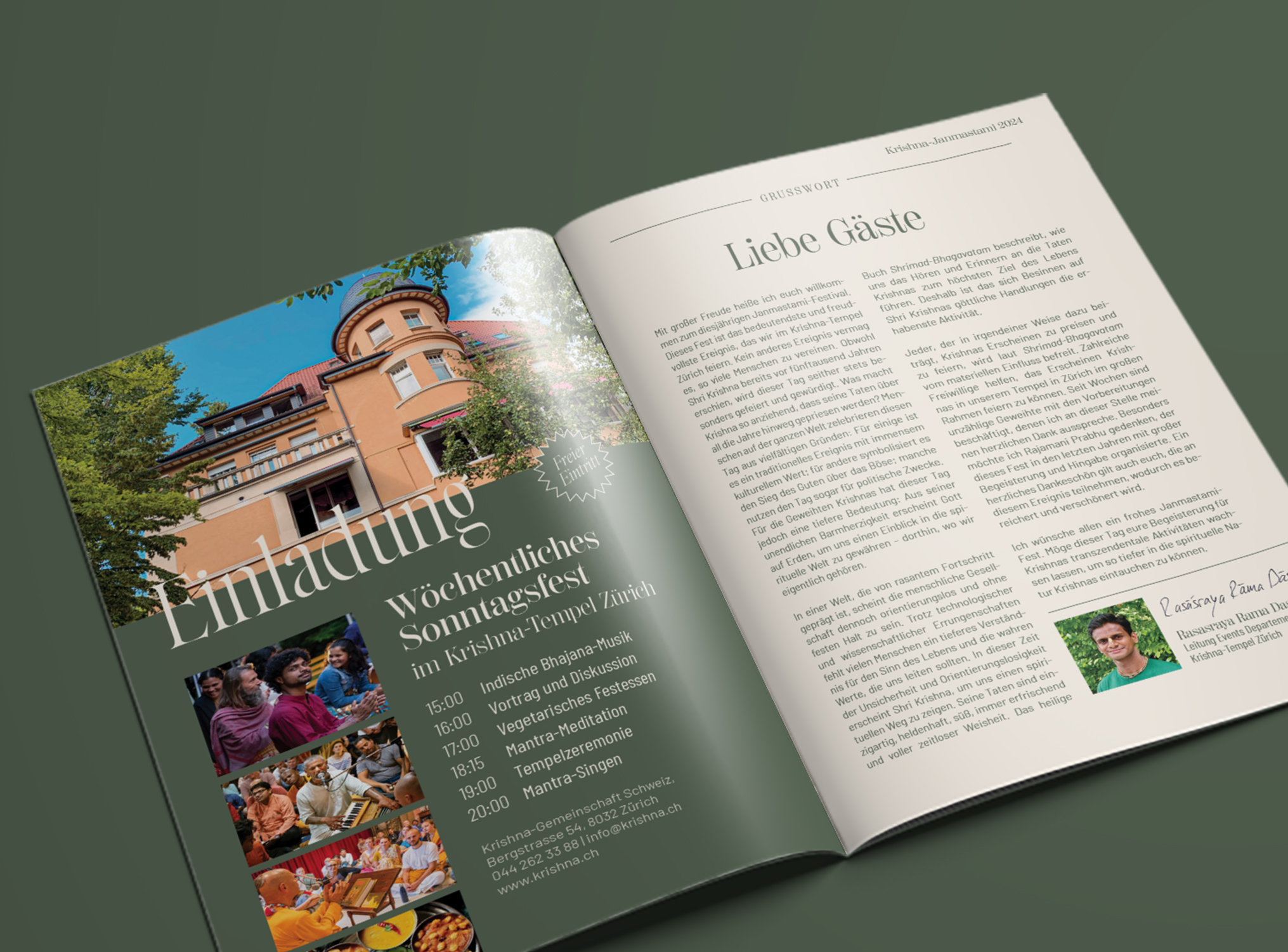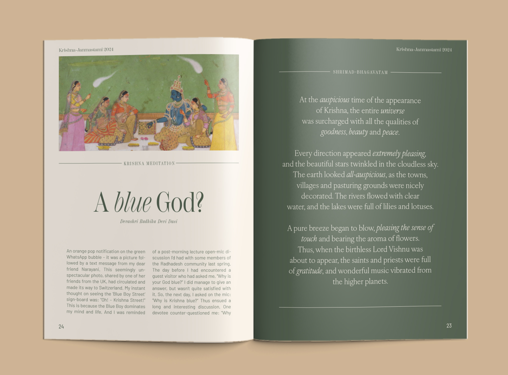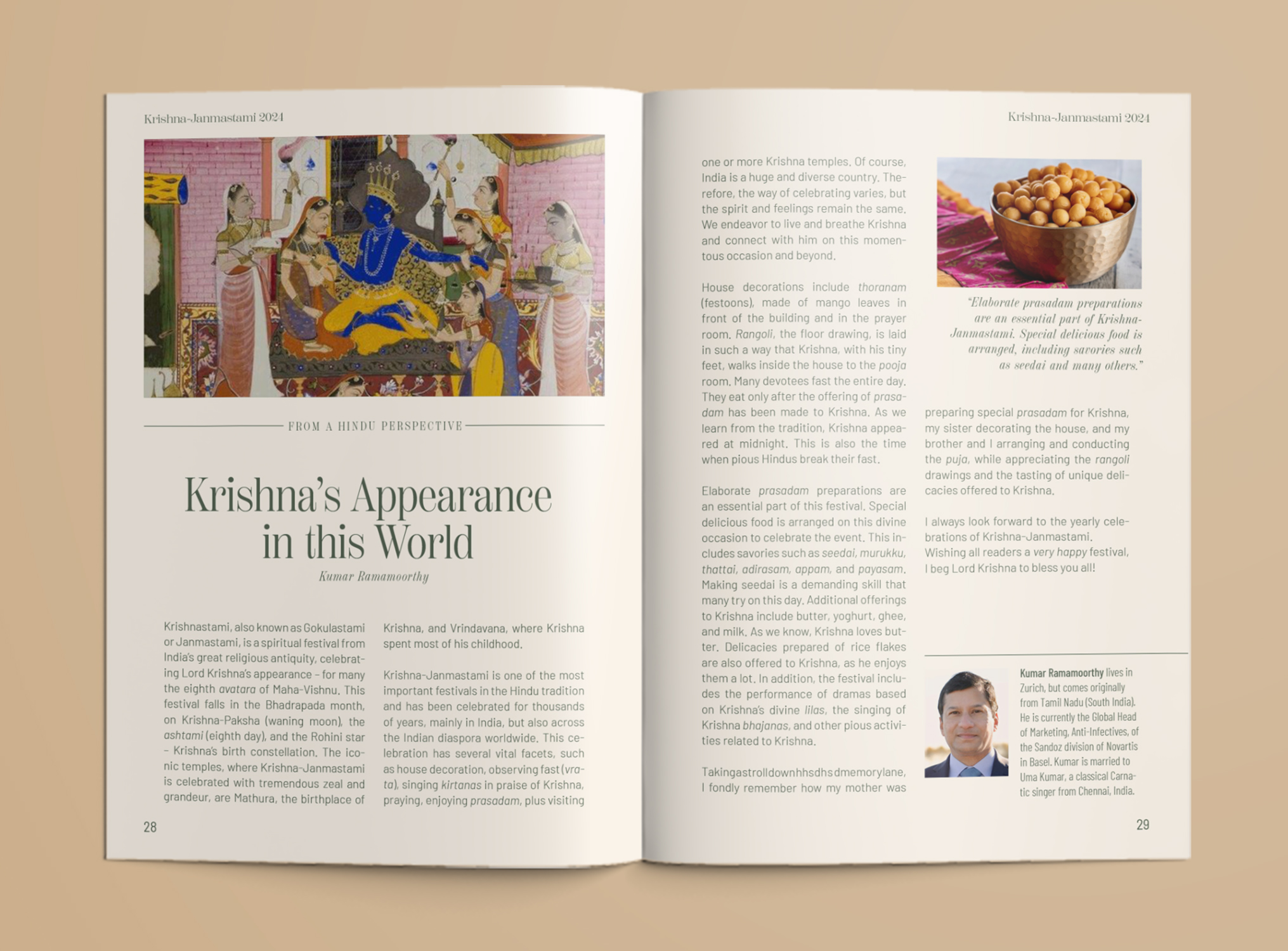 Every year for the Janmastami Festival, the temple interviews different devotees and writes small articles about the festival and the various connections the devotees have with it. These articles are then compiled into brochures, which are distributed for free on the day of the festival.